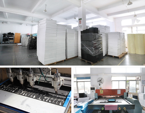 有最新自動化精準分切機6臺,自動150噸雙邊進料裁斷機8臺,自動雙邊粘合機6臺,雕刻機8臺。其他各種生產設備齊全,精確度高,質量保障。